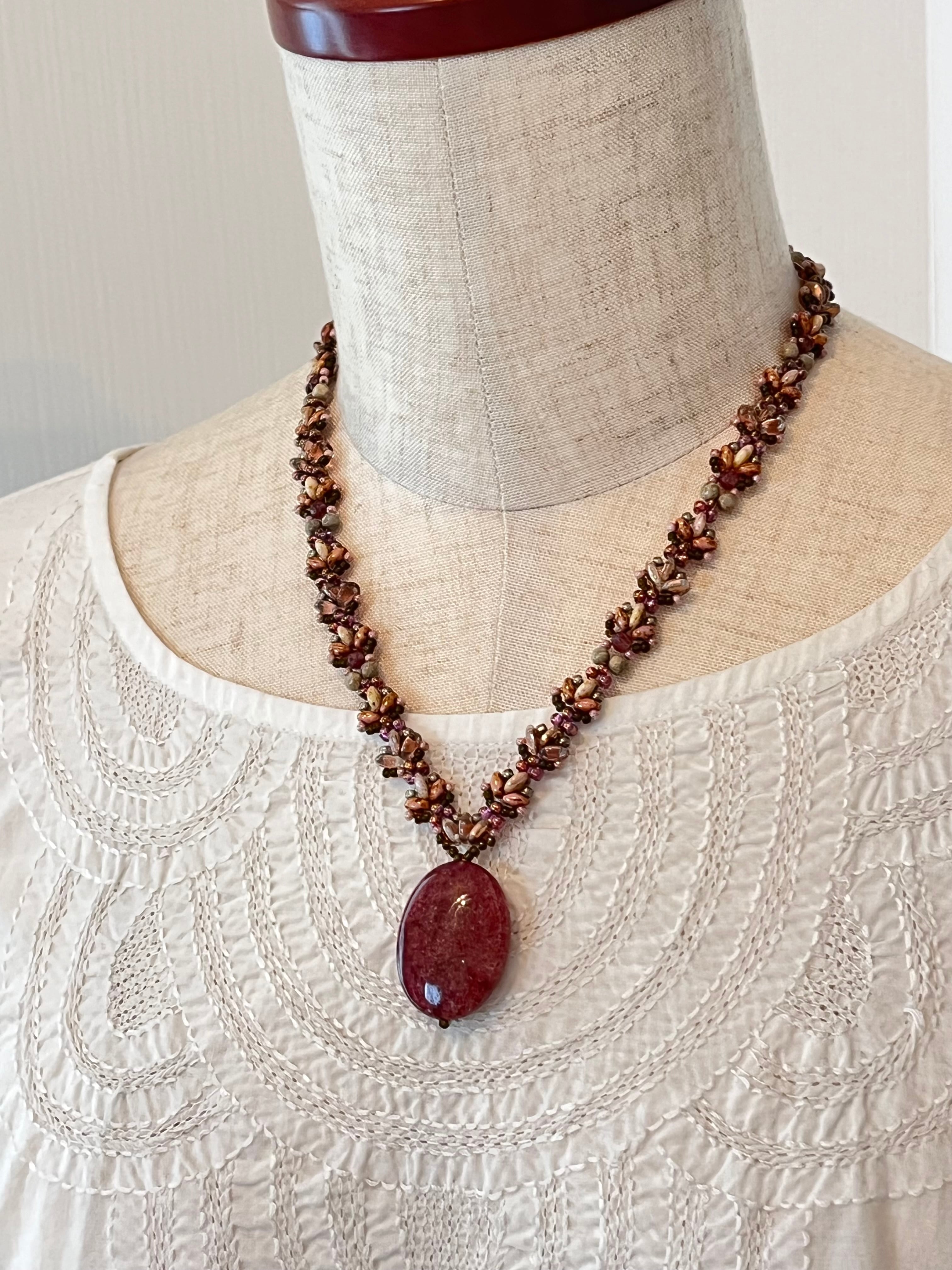 天然石モスコバイトを使用したアンティークカラーのアクセサリーです。ネックレス部分は、ツーホールビーズと天然石を使用、一つ一つこだわりを持ってセレクトしています。モスコバイトは、愛情と感情を引き出す効果があるとされ、身につけると心が和ませられると言われています。